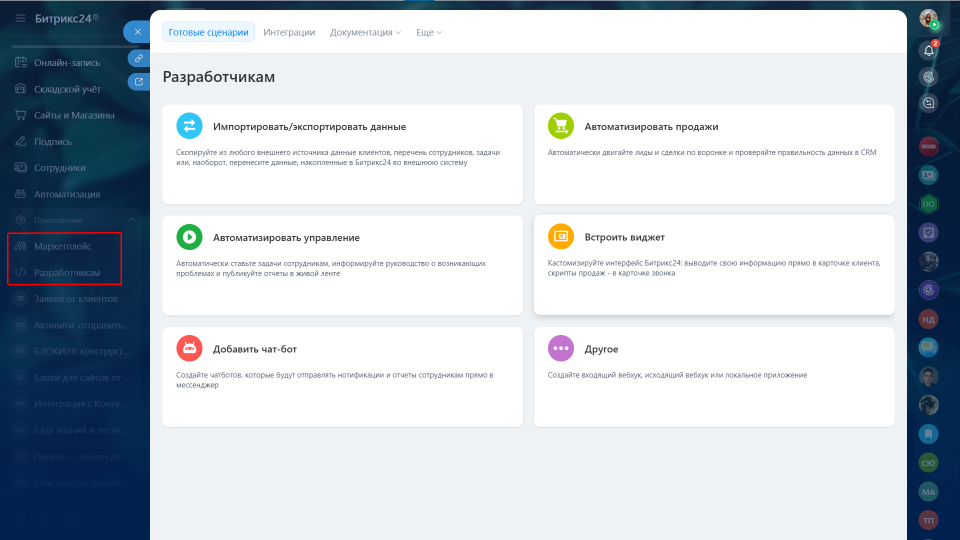 Помимо привычного функционала, в левом меню, сразу за вкладкой «Маркетплейс», скрывается отдельная зона - «Разработчикам». Она пригодится тем, кто планирует создавать локальные приложения, настраивать интеграции или расширять возможности Битрикс24 под нужды бизнеса.