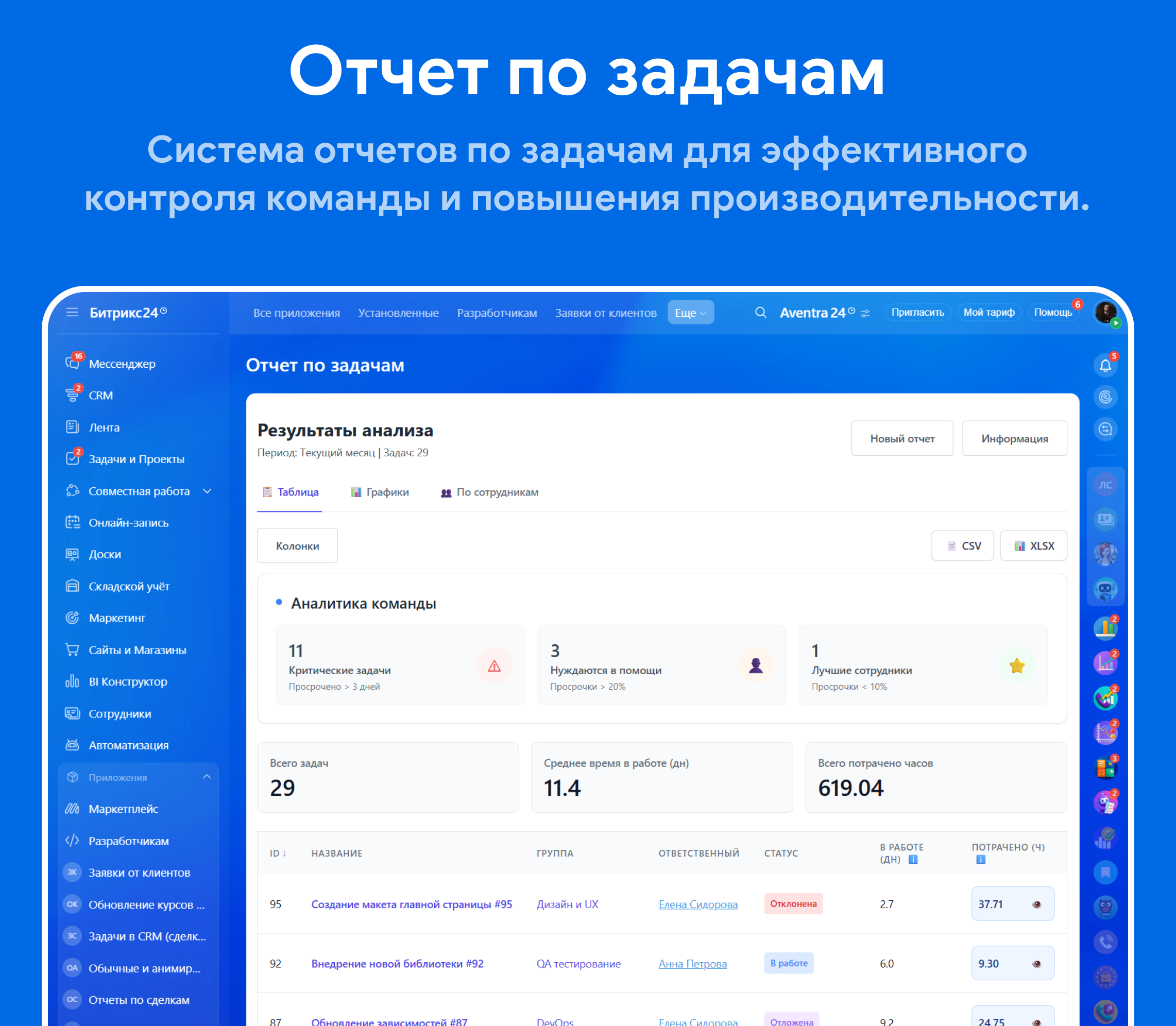 - Учет времени - трекеры трудозатрат по задачам и проектам, автоматические напоминания о дедлайнах, контроль занятости сотрудников.