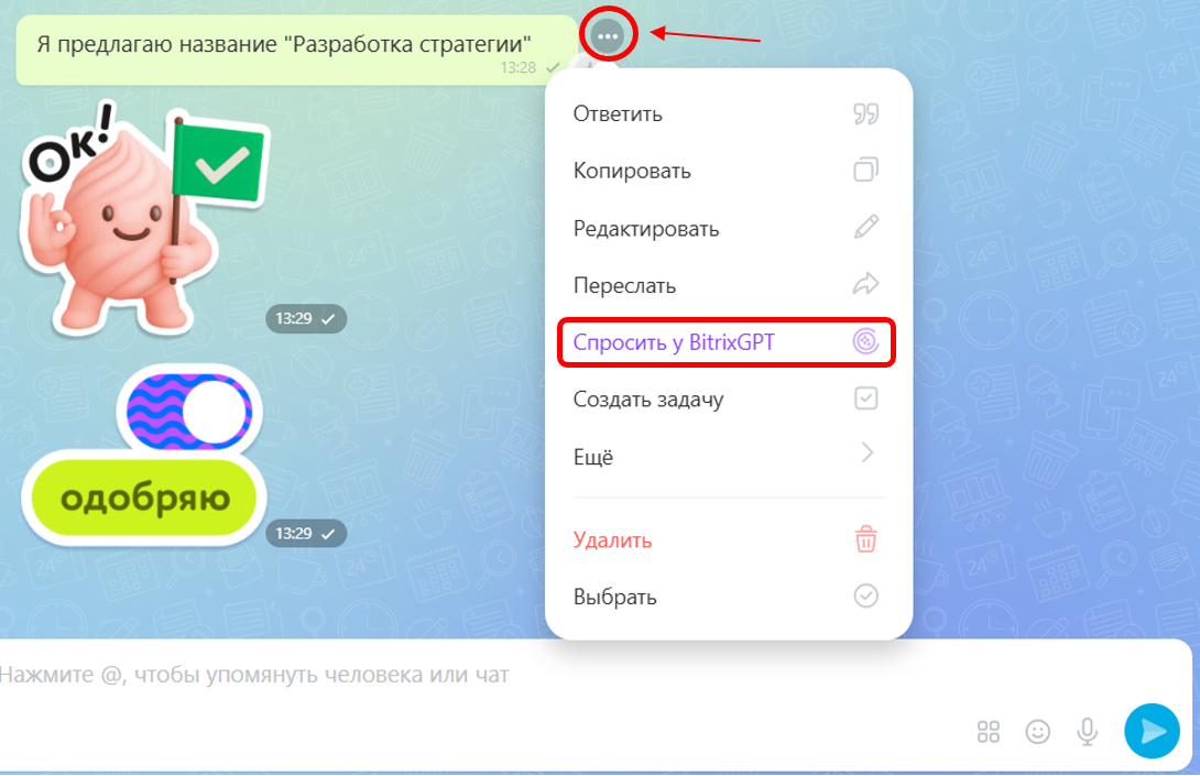 Важно: в чате задачи также можно обращаться к BitrixGPT, как и в любом диалоге в разделе «Мессенджер».