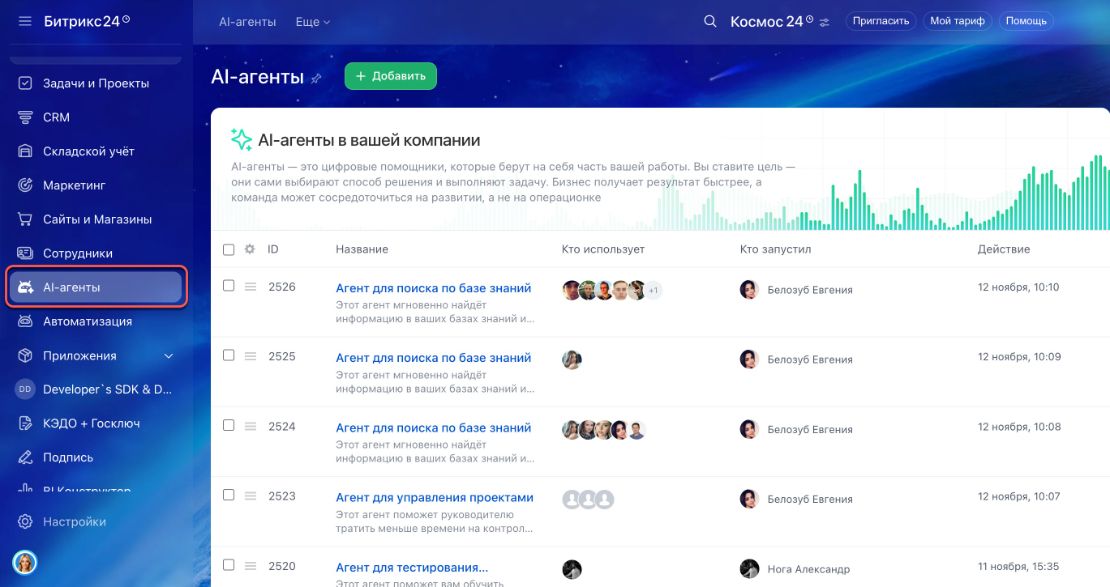 Представьте цифровых сотрудников, которые работают внутри «Битрикс24». Эти AI-агенты берут на себя всё, что отнимает время и силы: отвечают на типовые вопросы коллег, моментально находят документы, следят за сроками и контролируют нагрузку в проектах.