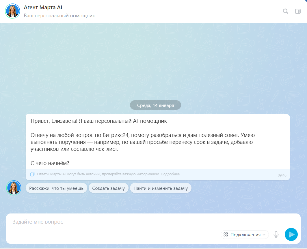Марта AI - личный гид и эксперт по «Битрикс24», который живёт в чате и готов помочь в любое время. Не знаете, как поставить задачу, найти файл или настроить напоминание? Спросите Марту, она ответит на вопрос и поэтапно покажет, как работать с нужным функционалом, помогая освоиться в системе в разы быстрее.