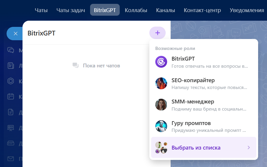 Платформа «Битрикс24» предлагает свыше 30 предустановленных ролей для ИИ-ассистента. Необходимую роль можно задать не только при создании нового диалога, но и в ходе уже начавшейся беседы.