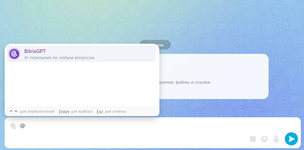 Кроме того, вы можете обратиться к AI-помощнику в рабочем диалоге. Для этого в строке ввода напишите символ @, выберите BitrixGPT из появившегося меню и после задайте вопрос - помощник ответит в этом чате.