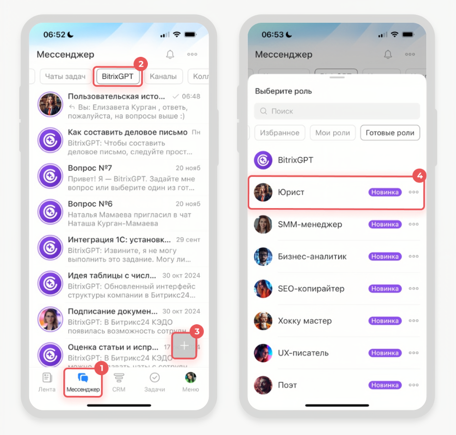Создайте отдельный чат с BitrixGPT, чтобы задавать ему вопросы. Сделать это можно с помощью кнопки на боковой панели или в общем списке в мессенджере.