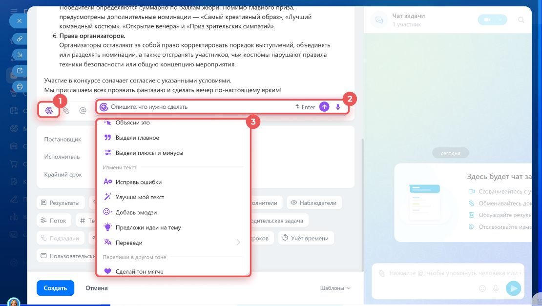 Достаточно набросать ключевые пункты в задаче, а AI сам доработает их до полноценного и детального описания. Можно не переживать за стиль и грамотность - помощник отредактирует текст, исправив все неточности.