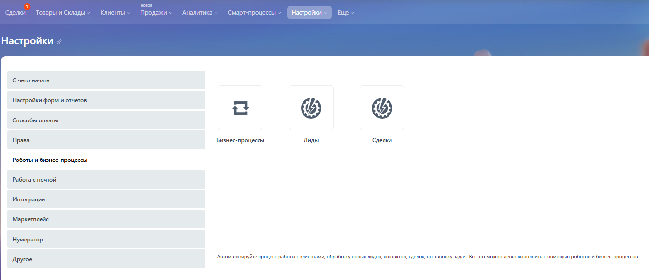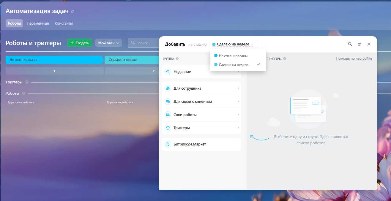 Если необходимо работать непосредственно над сущностью задачи, воспользуйтесь роботами: перейдите в раздел "Задачи и проекты" → "Роботы". Настраивайте автоматизацию на нужной стадии.