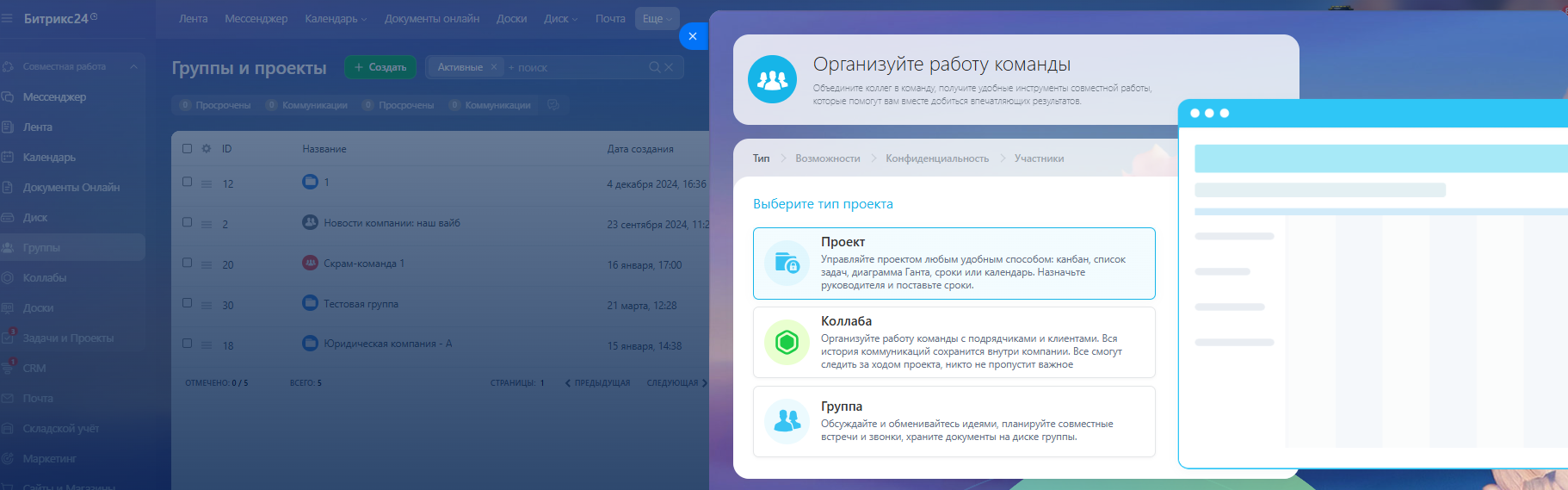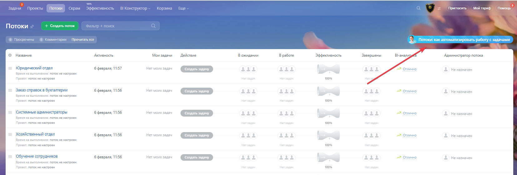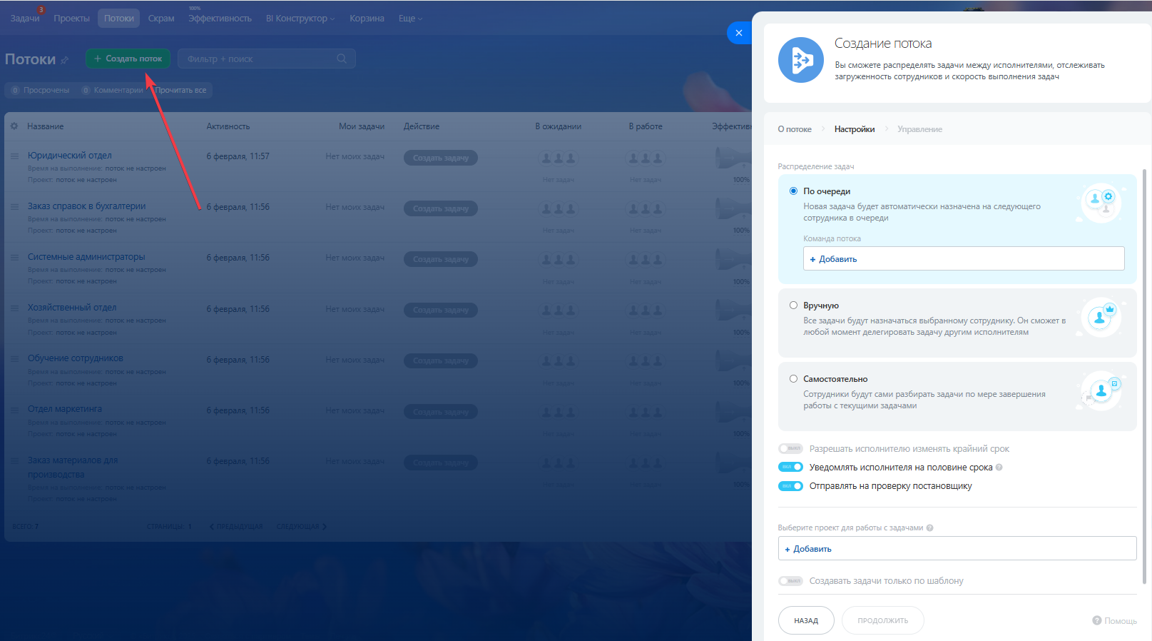 5. Используйте функционал Потоки раздела Задачи и проекты.