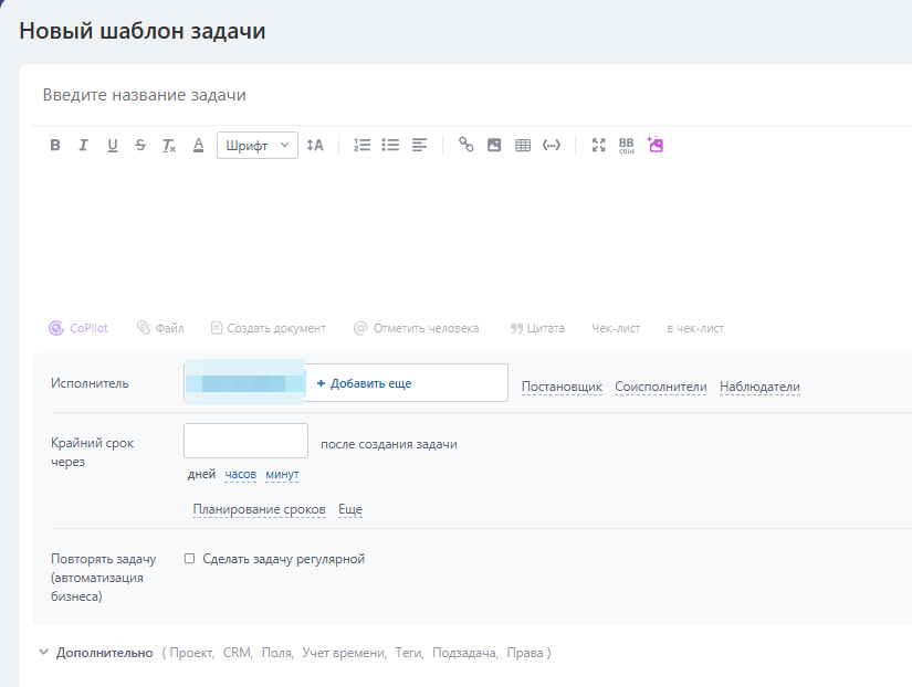 Битрикс24 позволяет создавать шаблоны для быстрой постановки задач с необходимыми требованиями. Для этого перейдите раздел "Задачи и проекты" → "Список всех шаблонов"→”Создать” и заполните необходимые поля.