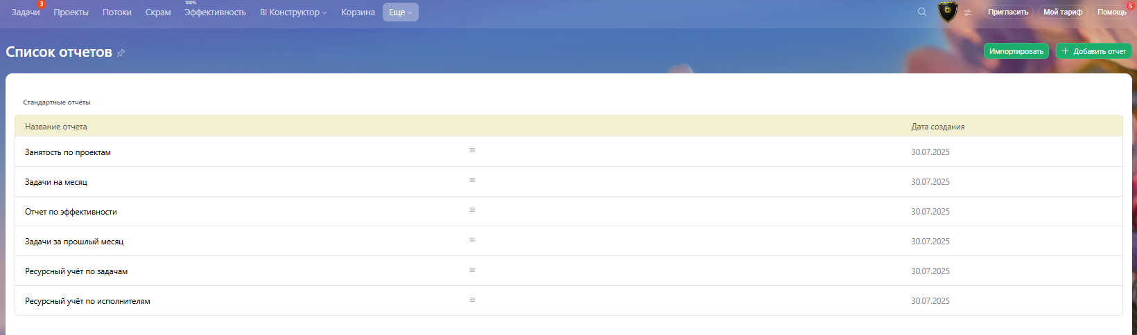 Используйте Отчеты BI-конструктора или предустановленные отчеты по задачам (добавляйте новые):