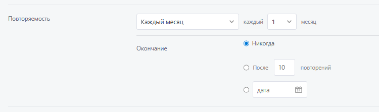 Для встреч (Календарь) в полной форме заполняйте поле Повторяемость (например, Каждый месяц):