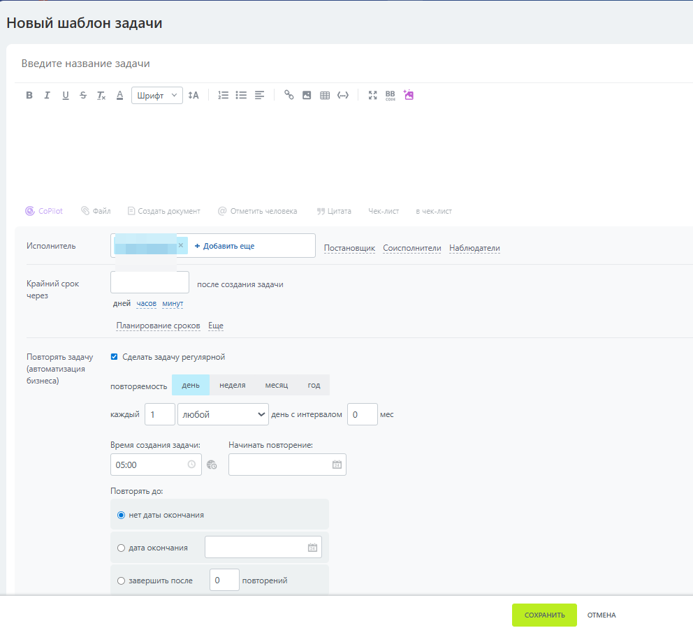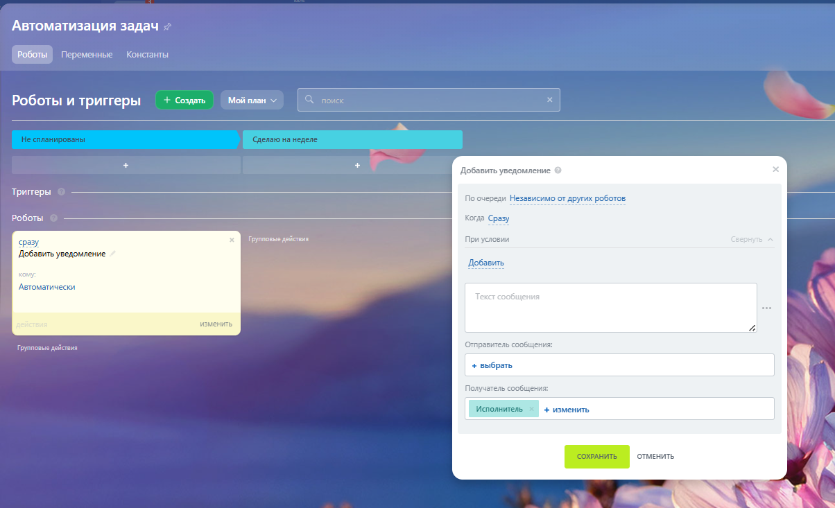 Создавайте роботов и бизнес-процессы внутри карточек задач или сделок для автоматической отправки сообщений при наступлении определённых условий.