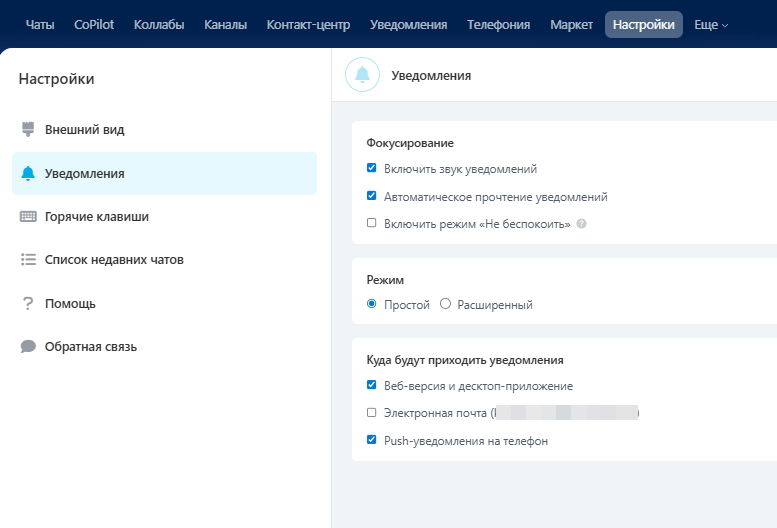 - Здесь можно включить или отключить получение внутренних уведомлений, push-уведомлений на мобильном устройстве, а также настроить параметры электронной почты.