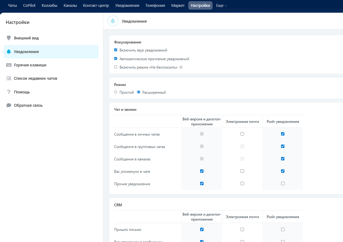 Расширенный режим позволяет более гибко настраивать уведомления для разделов Чат и звонки, CRM, Фотогалерея, Группы и Проекты, Учет рабочего времени, Бизнес-процессы, КЭДО + Госключ, Рейтинги, Лайки, Диск, Сообщения, Опросы, голосования, Календарь событий, Почта, Телефония, Email-маркетинг, Задачи, Wiki, Открытые линии, Интранет.