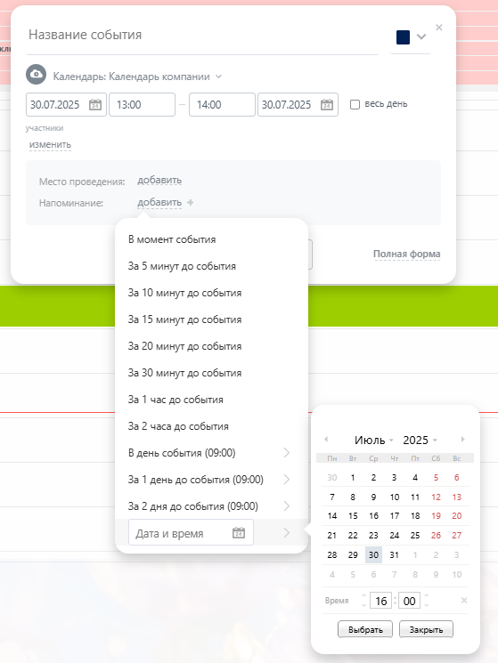 Календарь Битрикс24 позволяет планировать события с автоматическими напоминаниями: