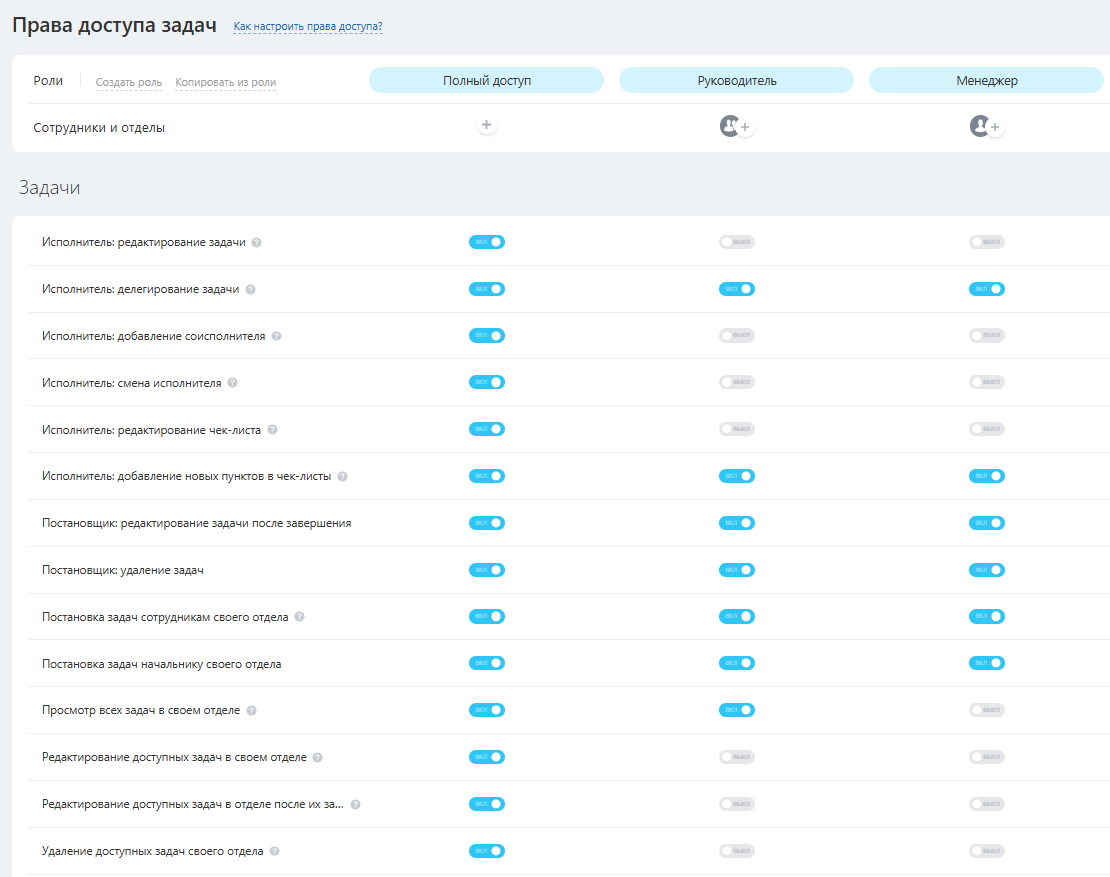 Настройка осуществляется по пути Задачи и Проекты – Права доступа
