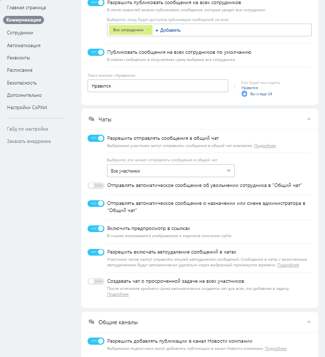 Перейдите в Настройки – Настройки Битрикс24 и проведите общие настройки как по интерфейсу меню, так и индивидуальным пунктам, в частности коммуникации или сотрудники.