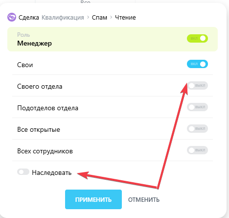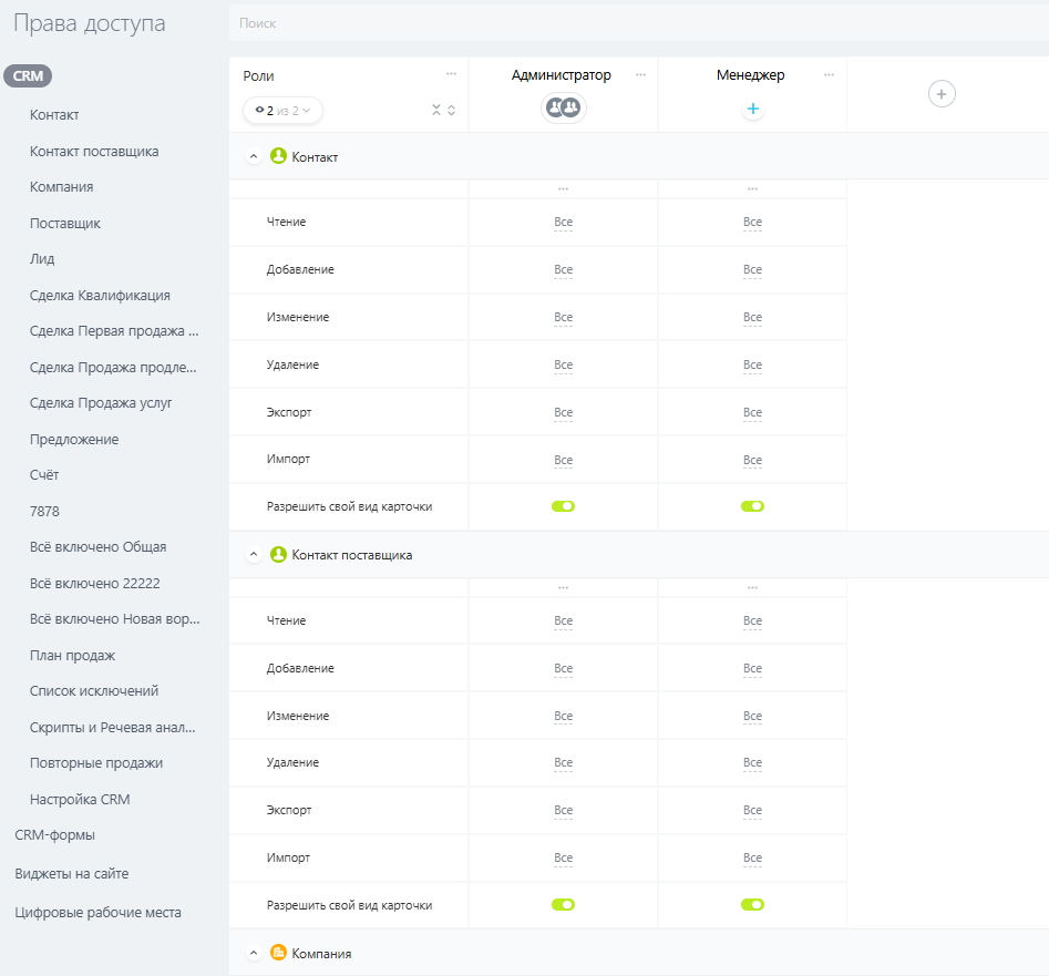 Для настройки перейдите в CRM – Настройки – Настройки CRM – Права