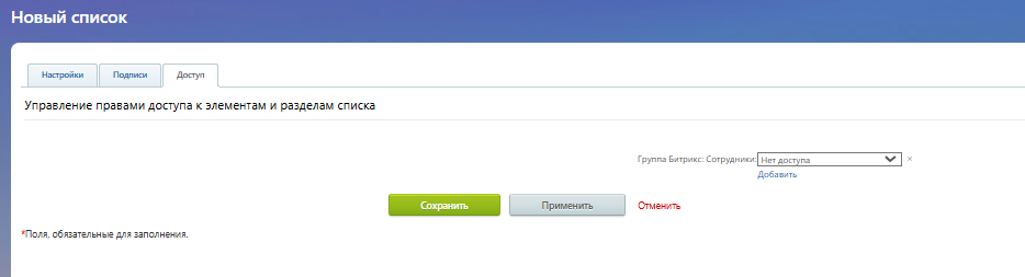 При работе с универсальными списками при создании права доступа регулируются на отдельной вкладке:
