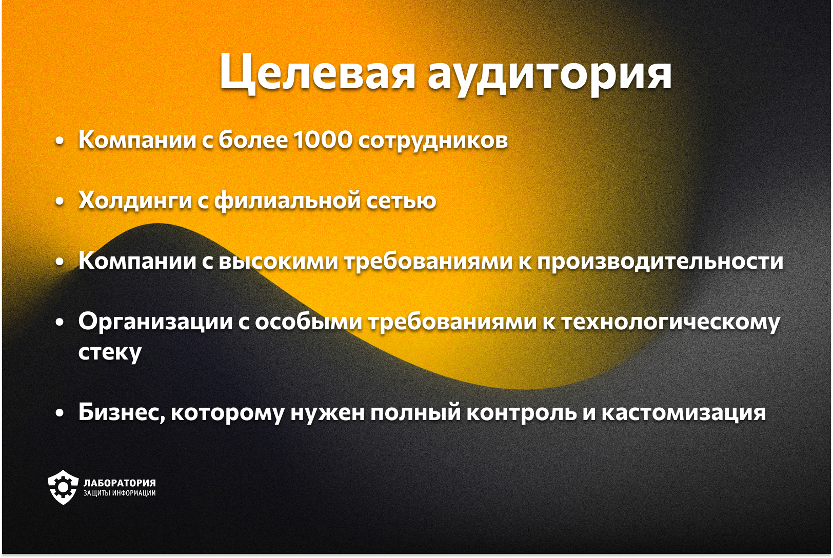Кому подходит: Крупным компаниям со сложной ИТ-инфраструктурой, холдингам с филиалами, организациям, которым важен полный контроль над данными и возможность кастомизации.